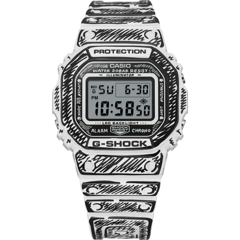 Casio G-Shock DW-5600JV-7ER × Joshua Vides – G-Shock 5600 speciální edice, bílé s černými grafickými motivy umělce Joshua Vides
