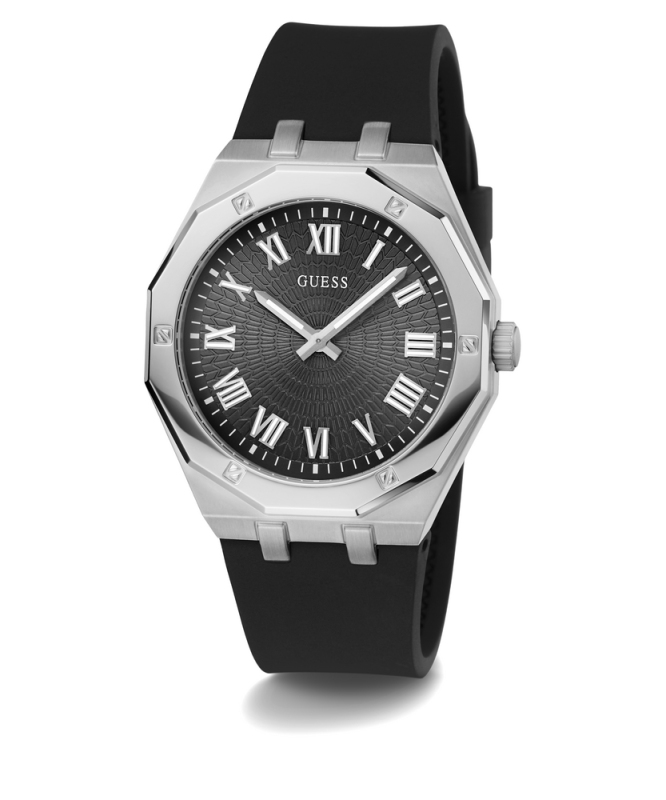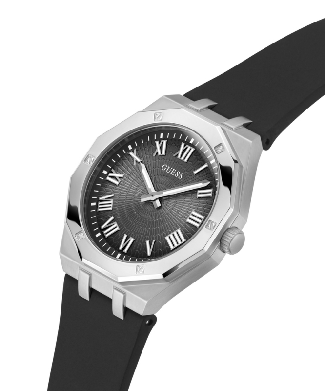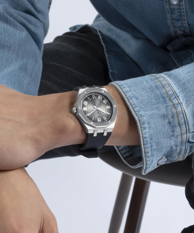 Leštěná povrchová úprava. Zapínání na přezku. Quarts baterie. Minerální tvrzené sklo. Bez podsvícení. Voděodolné do 50 metrů . Materiál pouzdra: nerezová ocel. Materiál pásku: silikon. Velikost pouzdra: 42 mm. Výška pouzdra: 9,75 mm. Délka pásku: 205 mm.