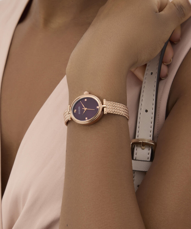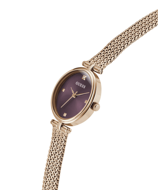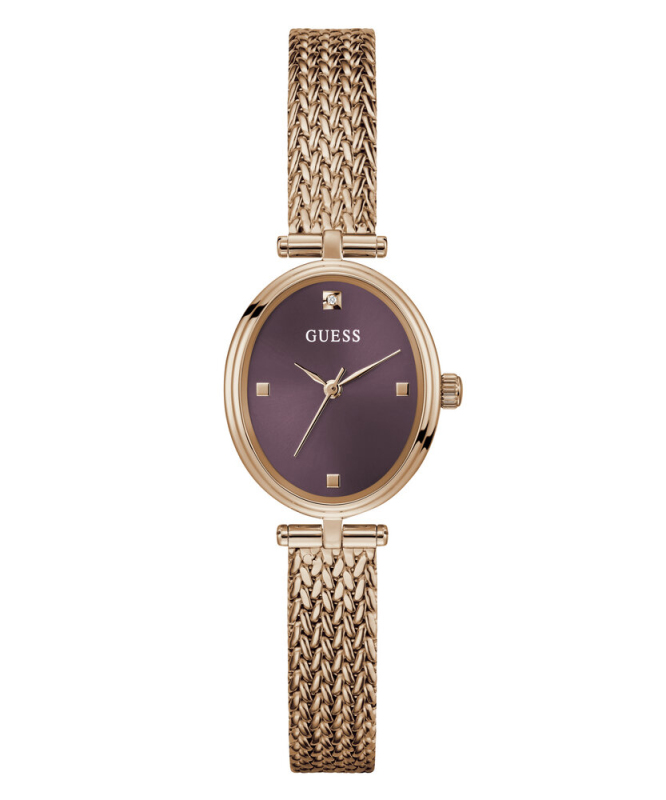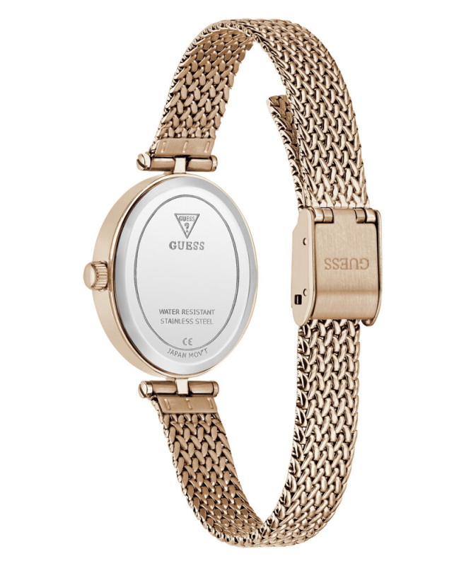 Leštěná povrchová úprava. Zapínání na posuvnou sponu. Quarts baterie. Minerální tvrzené sklo. Oválné pouzdro velikosti petite. Bez podsvícení. Voděodolné do 30 metrů . Materiál pouzdra: recyklovaná nerezová ocel. Materiál pásku: ocelová síťovina. Velikost pouzdra: 24 mm. Výška pouzdra: 7,6 mm. Šířka pásku: 10 mm.