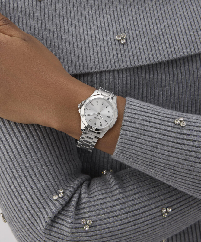 Leštěná povrchová úprava. Zapínání na překlápěcí sponu. Quarts baterie. Minerální tvrzené sklo. Kulaté pouzdro zdobené krystaly. Pouzdro střední velikosti . Bez podsvícení. Voděodolné do 50 metrů . Materiál pouzdra: recyklovaná nerezová ocel. Materiál pásku: nerezová ocel. Velikost pouzdra: 35 mm. Výška pouzdra: 9,2 mm. Šířka pásku: 16 mm.