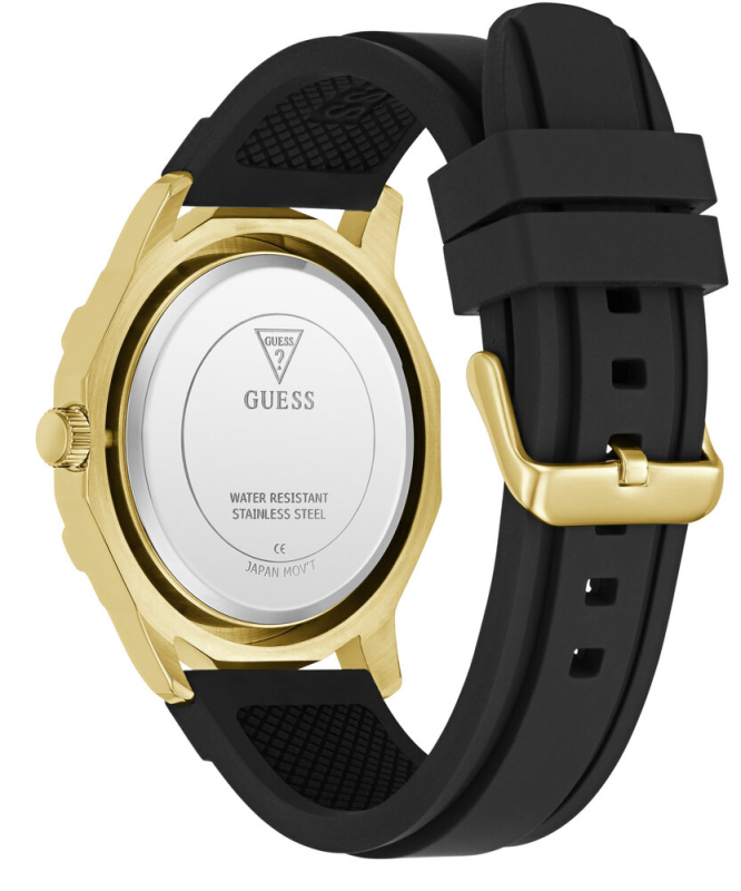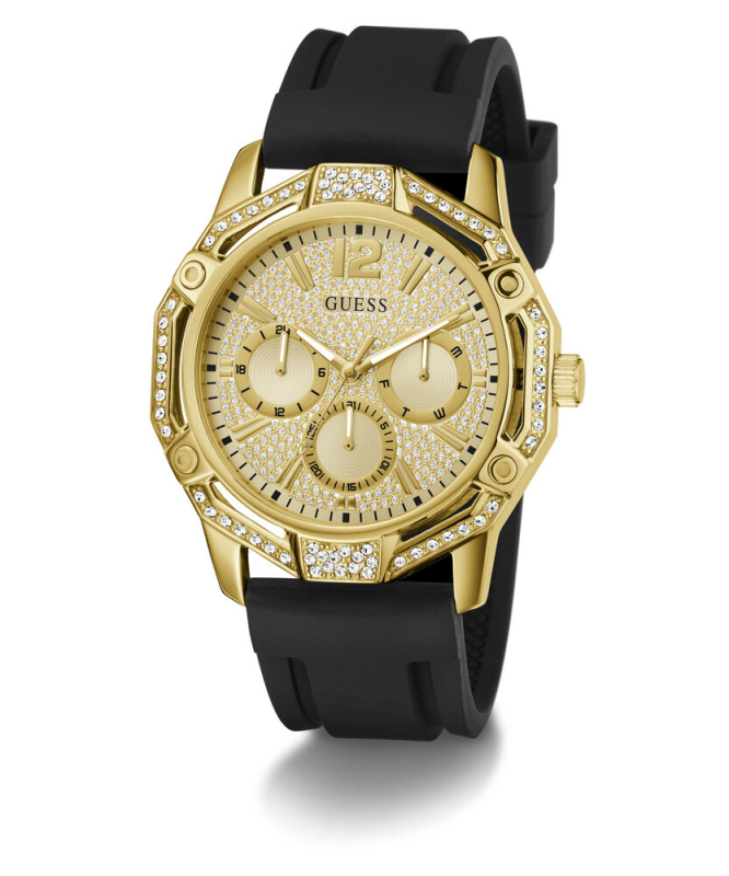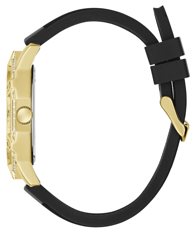 Leštěná povrchová úprava. Zapínání na přezku. Quarts baterie. Minerální tvrzené sklo. Kulaté pouzdro zdobené krystaly. Pouzdro velikosti XL . Bez podsvícení. Voděodolné do 30 metrů . Materiál pouzdra: recyklovaná nerezová ocel. Materiál pásku: silikon. Velikost pouzdra: 46 mm. Výška pouzdra: 10,4 mm. Šířka pásku: 24 mm.