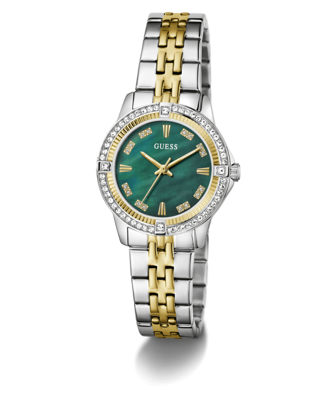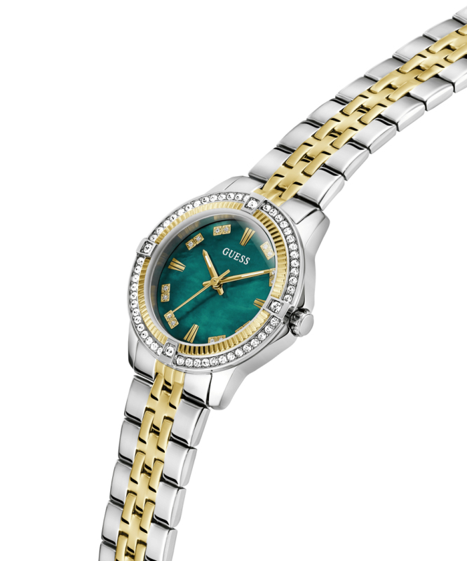 Leštěná povrchová úprava. Zapínání na překlápěcí sponu. Quartz analog hodinky. Ploché minerální sklo. Perleťový ciferník (MOP). Luneta a ciferník osazené krystaly. Kulaté pouzdro střední velikosti. Materiál pouzdra: nerezová ocel. Materiál pásku: nerezová ocel. Velikost pouzdra: 32 mm. Výška pouzdra: 8,4 mm. Rozteč nožek pouzdra: 16 mm. Voděodolnost: 3 ATM. Váha hodinek: 74 g.