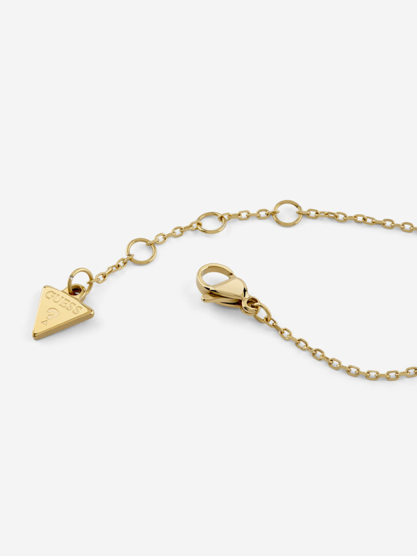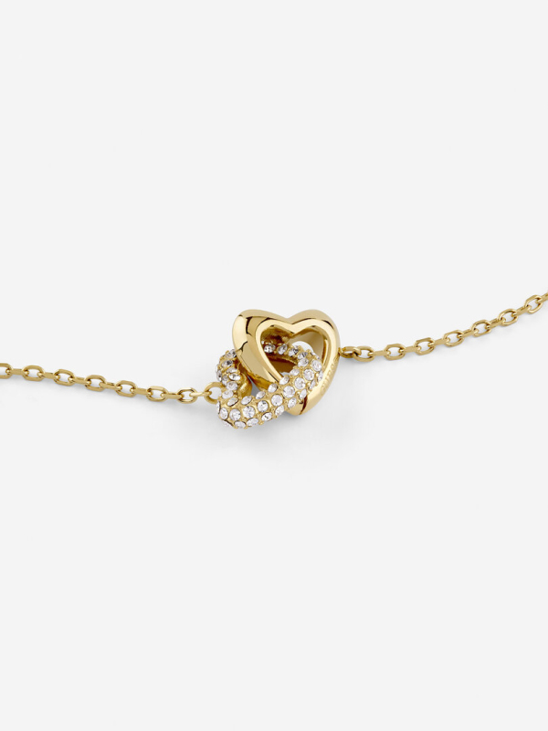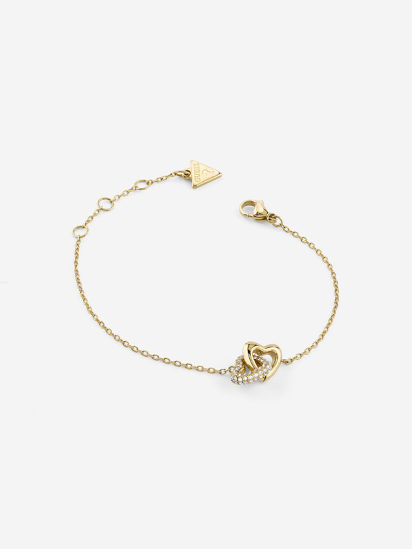 Náramek z nerezové oceli. Článkový řetízek s propojenými srdíčky. Srdíčko osazené čirými krystaly. Logo Guess na zapínání. Karabinkové zapínání na 3 velikosti. Délka náramku: 14,6 cm + 3,8 cm. Velikost srdce: 15 mm. Složení: 95 % nerezová ocel, 5 % krystaly.