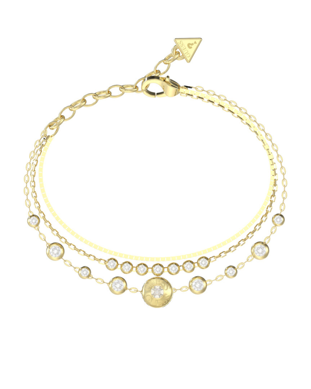 Náramek z nerezové oceli. Víceřadé provedení zdobené krystaly a kubickou zirkonií. Logo Guess na přívěšku. Jemné článkové řetízky. Karabinkové zapínání na více velikostí. Délka náramku: 14,6 cm + 3,8 cm. Složení: 94 % nerezová ocel, 5 % krystaly, 1 % kubická zirkonie.