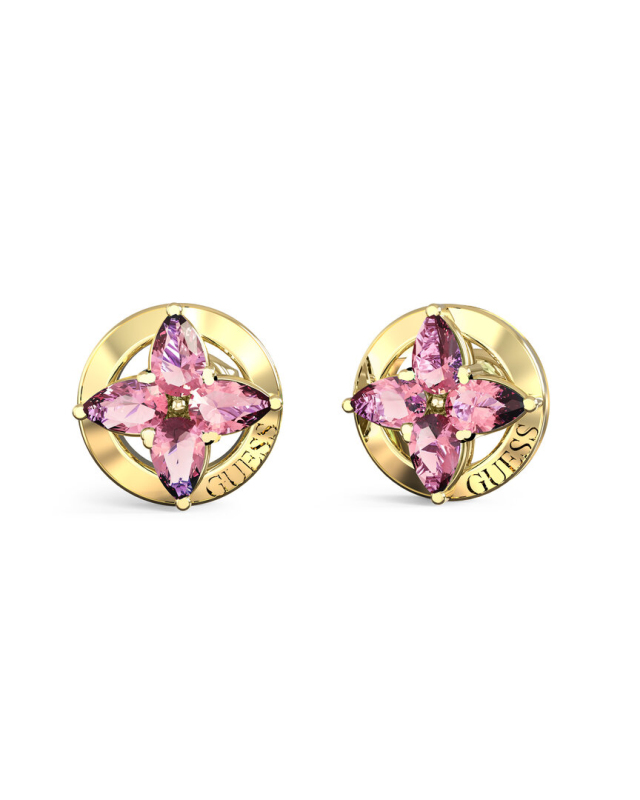 Náušnice z nerezové oceli. Peckové náušnice s květinovým motivem. Zdobené kubickou zirkonií. Logo Guess gravírované. Zapínání na puzetku. Velikost náušnic: 8 mm. Složení: 98 % nerezová ocel, 2 % kubická zirkonie.