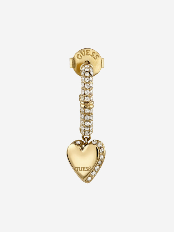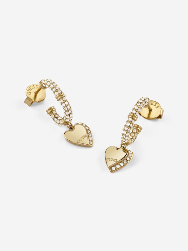 Náušnice z nerezové oceli. Polo-kruhové náušnice ve tvaru srdce zdobené pavé krystaly. Logo Guess na přívěšku. Zapínání na puzetku. Délka náušnic: 25 mm. Složení: 93 % nerezová ocel, 7 % krystaly.