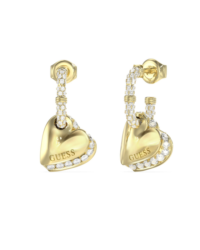 Náušnice z nerezové oceli. Polo-kruhové náušnice ve tvaru srdce zdobené pavé krystaly. Logo Guess na přívěšku. Zapínání na puzetku. Délka náušnic: 24 mm. Složení: 93 % nerezová ocel, 7 % krystaly.