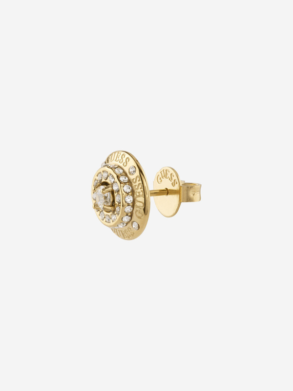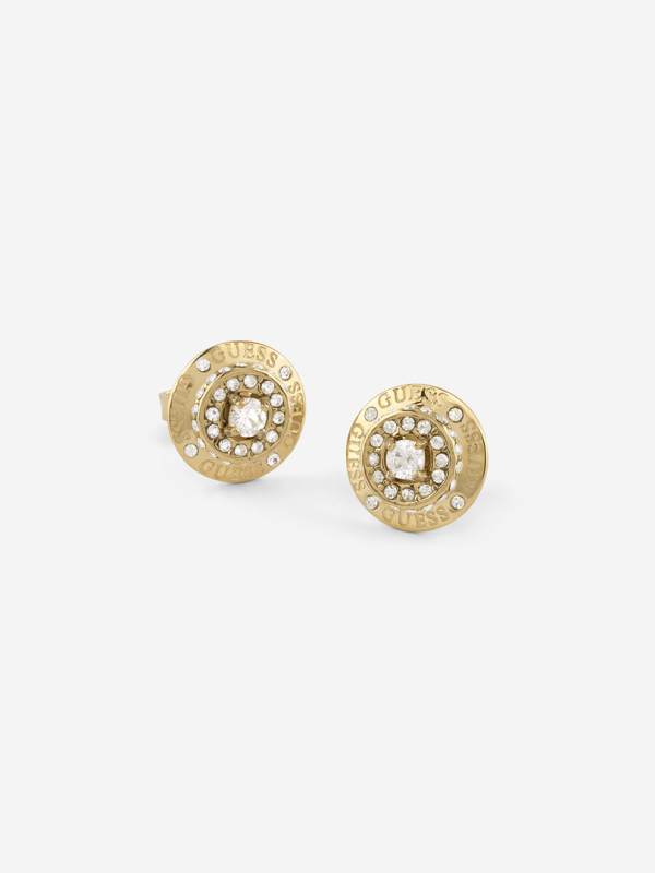 Náušnice z nerezové oceli. Puzetové náušnice Guess coin. Pecka zdobená krystaly a kubickou zirkonií. Zapínání na puzetku. Velikost náušnic: 11 mm. Složení: 93 % nerezová ocel, 6 % krystaly,. 1 % kubická zirkonie.