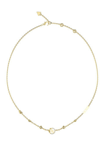 Náhrdelník z nerezové oceli. Přívěšek ve tvaru loga 4G s květy a lístky. Zdobené krystalovými zirkony. Logo Guess na řetízku. Zapínání na karabinku. Nastavitelné zapínání na 3 velikosti. Délka: 40,5 - 45,5 cm. Přívěšek: 1 cm.
