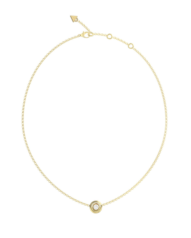 Náhrdelník z nerezové oceli. Kulatý přívěšek se zirkonem a krystaly. Gravírované logo Guess na přívěsku. Zapínání na karabinku. Nastavitelné zapínání na 3 velikosti. Délka: 40,7 - 45,7 cm. Přívěsek: 12 mm.