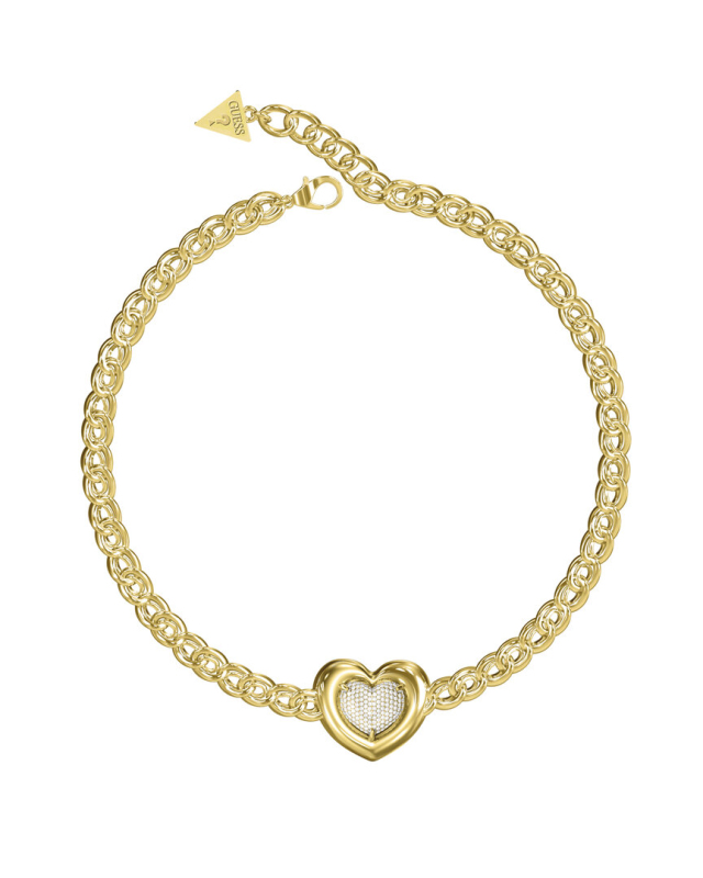Náhrdelník z nerezové oceli. Přívěšek ve tvaru srdce s krystaly. Řetěz tvořený z tvarů srdce. Gravírované logo Guess na přívěsku. Zapínání na karabinku. Nastavitelné zapínání. Délka: 40,7 - 45,7 cm. Přívěšek: 2,2 cm.