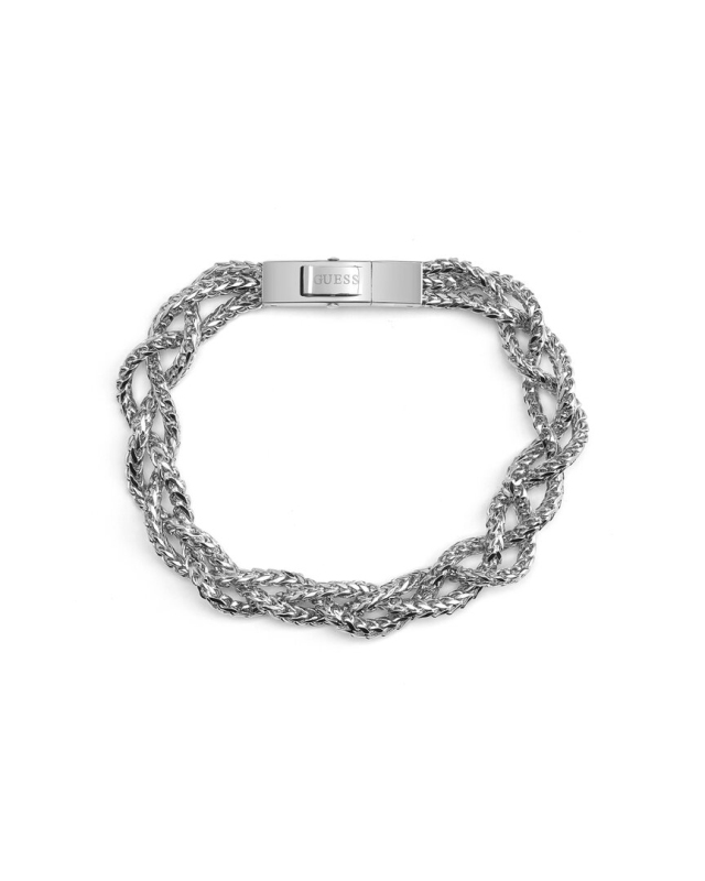 Náramek z nerezové oceli. Pletené řetízkové provedení. Logo Guess na zapínání. Snap-lock zapínání. Délka náramku: 19 cm. Šířka jednoho řetízku: 2 mm. Složení: 100 % nerezová ocel.
