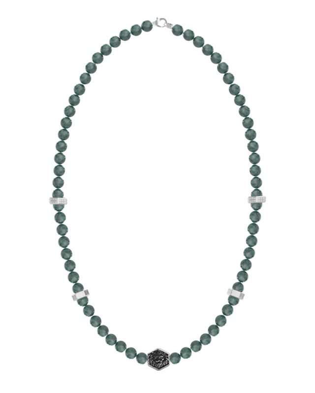 Náhrdelník z nerezové oceli a přírodních kamenů. Korálkové provedení. Hexagonální detail s hlavou lva. Přírodní kámen - zelený africký jadeit. Karabinkové zapínání. Délka náhrdelníku: 58,4 cm. Průměr korálků: 8 mm. Složení: 40 % nerezová ocel,. 60 % přírodní zelený africký jadeit.