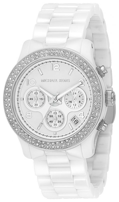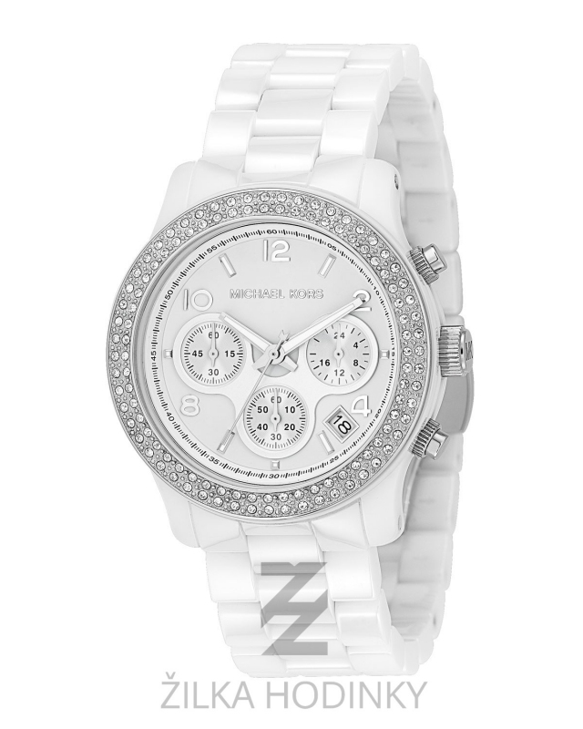 Luxusní dámské hodinky z keramického materiálu osázené krystaly od Swarovskeho. Hodinky jsou vybaveny datumovkou a stopkami