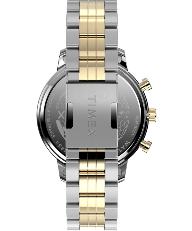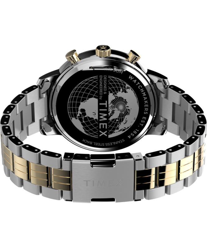 Leštěná povrchová úprava. Zapínání na přezku. Quarts baterie. Minerální tvrzené sklo. Chronograf. Voděodolné do 50 metrů . Materiál pouzdra: mosaz s nízkým obsahem olova. Materiál pásku: nerezová ocel. Velikost pouzdra: 45 mm. Výška pouzdra: 11 mm. Šířka pásku: 20 mm. Délka pásku: 205 mm.