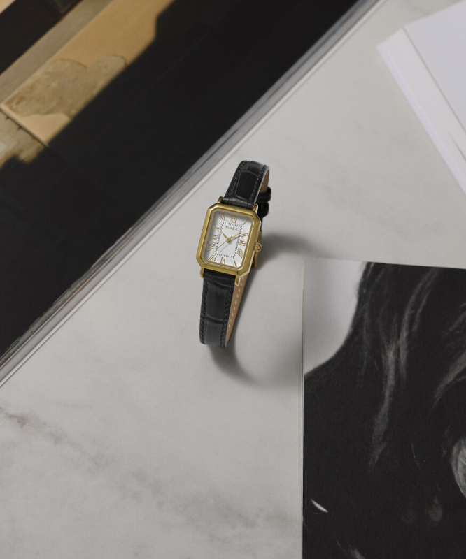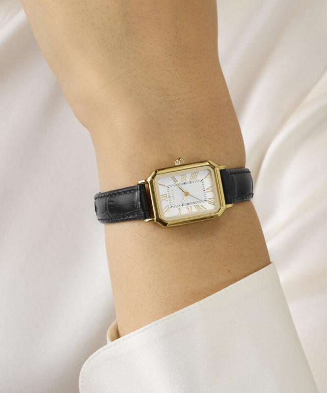 Leštěná povrchová úprava. Kožený pásek s krokodýlím vzorem. Zapínání na přezku. Římské indexy. Quartz analog baterie. Minerální sklo. Obdélníkové pouzdro. Voděodolné do 30 metrů. Materiál pouzdra: slitina. Materiál pásku: kůže. Velikost pouzdra: 21 mm. Výška pouzdra: 8 mm. Šířka pásku: 12 mm. Obvod zápěstí: 135 - 190 mm.